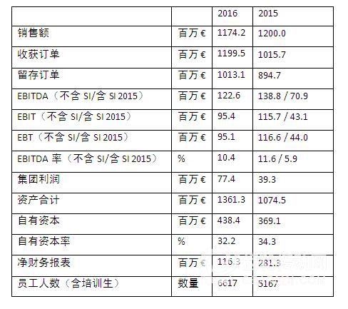 據德國舒勒集團公布的報告顯示,舒勒集團在2016年收獲訂單(+17.6%)和留存訂單(+13.5%)均有顯著增長。截至2016年12月31日,訂單總額達12(上年10.2)億歐元,留存訂單達10.1(上年8.9)億歐元。相對疲軟的開年過后,2016年集團銷售額仍達11.7(上年12)億歐元,幾乎與上年持平。2016年舒勒集團稅息折舊及攤銷前利潤(EBITDA)達1.226億歐元,遠超上一年調整前的7090萬歐元。