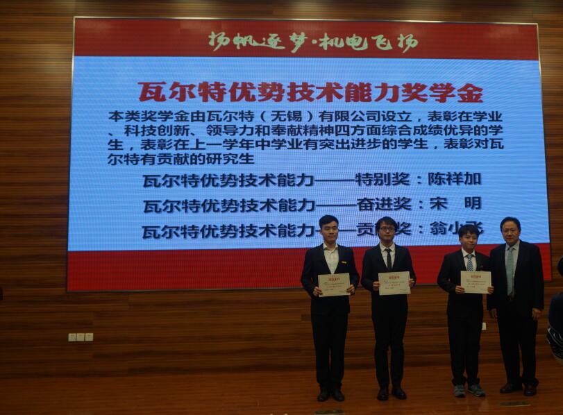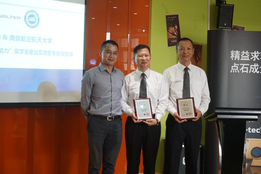 瓦爾特“優勢技術能力”獎學金于瓦爾特無錫有限公司于2016年公司成立20周年慶典之際設立,承諾向南京航空航天大學捐贈資金10萬元,旨在表彰于學業、科技創新、領導力和奉獻精神四個方面綜合成績優異以及有突出進步或有研究成果貢獻的學生。經過激烈的答辯、角逐,層層、綜合考核,本年度共有三名學生獲得了殊榮,分別是特別獎—陳祥加;貢獻獎—翁小飛;奮進獎—宋明。