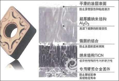 CVD涂層開始只有單層的TiC,TiN等。后有了雙層,甚至多層。之后又出現了包含強韌厚膜,納米結構的多層等。每層各有其相應的功能。圖1是新開發這種先進系列中MC6015涂層結構的剖面圖及各層主要功能。