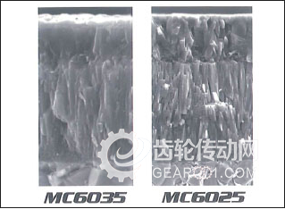 MC6000系列各涂層均有Al2O3層,沉積時又對它采用了最新的“厚膜納米結構”和“晶體成長控制技術”(圖4),與以往相比,晶粒細化了,生長又控制在一個方向,可同時提高硬度和韌性,并能與下面的TiCN涂層結合得更緊密(圖5)。Al2O3層下面的TiCN層也是納米結構,沉積時控制使其結晶生長形成強韌的纖維結構(圖4)進一步增強其耐破損能力,使在高速條件下,整體的耐磨耐破損性能進一步得到提升。