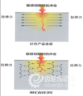 如之前所提到,CVD涂層易生成拉伸殘余應力,以往的產品加工時,拉伸應力造成的龜裂,會直接延伸到涂層內部,是造成破損的原因。但先進MC6035的組織結構可成功緩和拉伸應力,分散斷續切削的沖擊,抑制破損(圖7)。通過對多種材料以不同切削速度、切深進行的斷續切削實驗,證明MC6035 的壽命遠超過去的產品。另外本系列涂層刀片還研發了新的基體材料,新基體材料和涂層之間,特別注意使之形成均勻的強韌中間層,也可防止龜裂延伸,提高耐破損性。