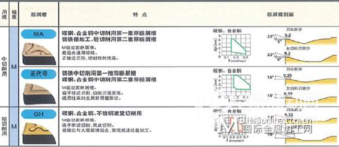 UE6120是在通用性較好的UE6020基礎上進行改進后推出的新產品。它的幾層涂層成分、組織、結構大致與過去的系列相同,但各層厚度,具體的組織結構有所不同,更強調了提高韌性,因此韌性耐破損性超過了以往。它只有3種斷屑槽;MA,無代號和GH(圖9)。故也便于選擇。僅用這一種材料,只要改變少數幾種斷屑槽,就可以進行輕切削, 中切削, 粗加工。切削深度ap為0.3mm-6mm。不但可以切鋼、合金鋼,而且可以切削鑄鐵、不銹鋼等,加工材料的范圍也擴大了。強斷續切削、中斷續切削,以及連續切削皆能勝任。根據零件表面斷續程度不同,切削速度也可從175m/min到305m/min。在圖9中,還可以見到各斷屑槽的結構形狀和它們所適應的進給量f和切深ap范圍。