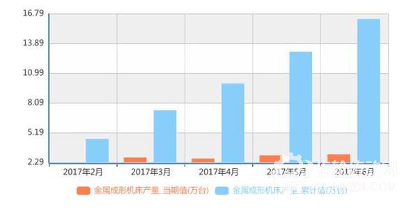 參考前瞻產業研究院《中國機床行業發展前景預測與投資分析報告》整理數據顯示,2017年6月我國金屬成形機床當月產量3.1萬臺,同比增長6.9%,1-6月累計產量16.3萬臺,累計增長8.7%。