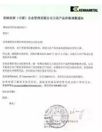 肯納亞洲(中國)企業管理有限公司發布企業刀具產品價格調整的通知,受諸多因素的影響,肯納金屬決定自2017年10月1日起,對相關刀具產品進行適度的價格調整。