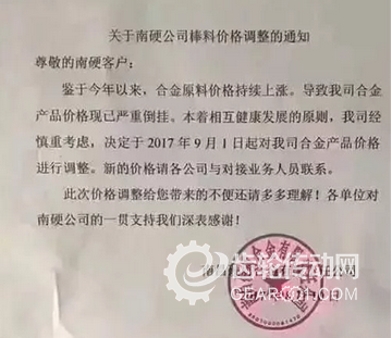 南昌硬質合金有限責任公司發布棒料價格調整的通知,由于合金原料價格價格持續上漲,南硬公司決定自2017年9月1日起對公司合金產品價格進行調整。