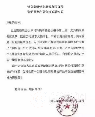 崇義章源鎢業股份有限公司發布產品價格調整的通知,由于硬質合金原材料鎢和鈷價格的不斷上漲,章源鎢業決定自2017年8月20日起,公司產品一律按新價格執行。