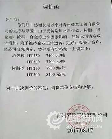 青州豪章工貿有限公司發布產品價格調整的通知,公司鑄件調整價格已確定,消失模HT250定價7400/噸、HT300定價7700/噸;樹脂砂HT250定價7900/噸、HT300定價8200/噸。