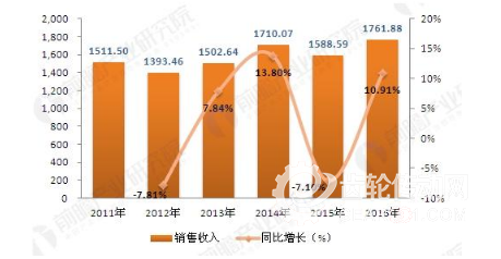 2011-2016年我國金屬機(jī)床行業(yè)銷售收入變化情況(單位:億元,%)