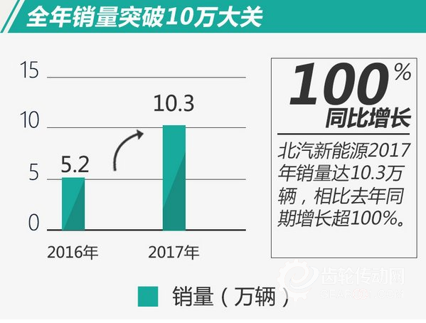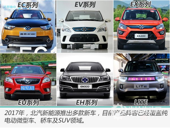 北汽新能源目前布局有EH、EU、EX、EV、EC、LITE六大系列共10余款純電動車,截止2016年已經連續四年蟬聯國內純電動汽車市場銷量冠軍。從北汽新能源官方獲悉:2017年北汽新能源銷量再創新高,達103,199輛,同比增長100.16%。根據此前消息,在2018年北汽新能源將推出3款全新車型,進一步豐富產品陣容。