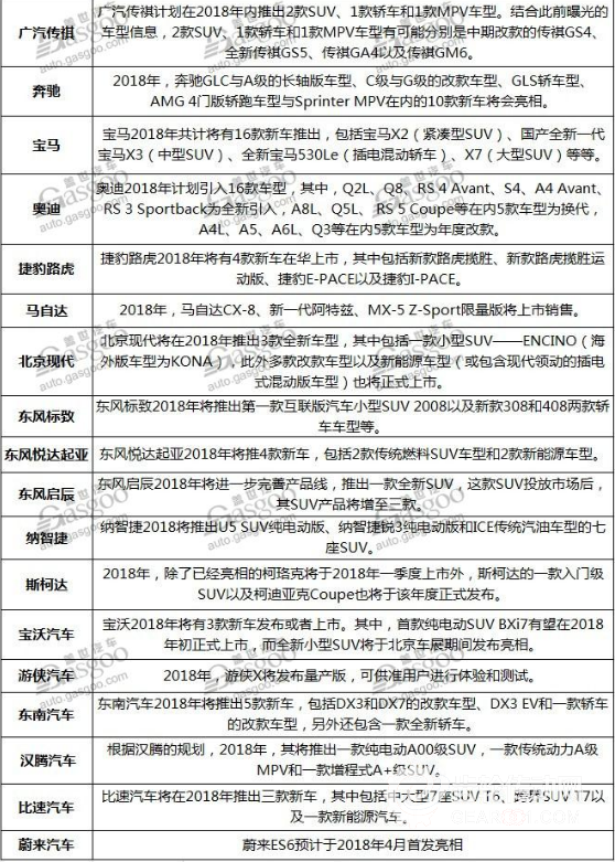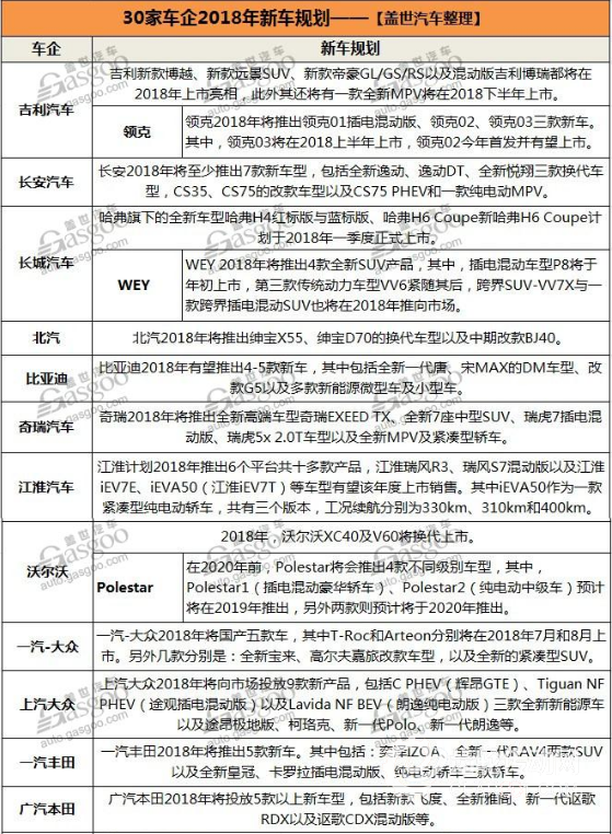 在剛剛過(guò)去的2017年里,汽車市場(chǎng)風(fēng)云變幻,車企“幾家歡喜幾家愁”。而面對(duì)已經(jīng)到來(lái)的2018年,眾多車企已是摩拳擦掌,從備受關(guān)注的產(chǎn)品戰(zhàn)略方面來(lái)看,2017年底開始,各大車企2018年的新車規(guī)劃便陸續(xù)被爆出。汽車行業(yè)新一輪爭(zhēng)奪戰(zhàn)拉開帷幕,精彩大戲即將輪番上演。近日,蓋世汽車匯總了30家車企的2018年新車規(guī)劃情況(排名不分先后),一起來(lái)看看他們的新車規(guī)劃有哪些看點(diǎn),而誰(shuí)又更勝一籌?