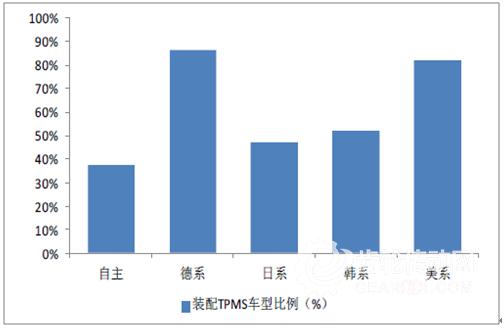 國(guó)內(nèi)市場(chǎng)各品牌車型裝配TPMS比例(%)