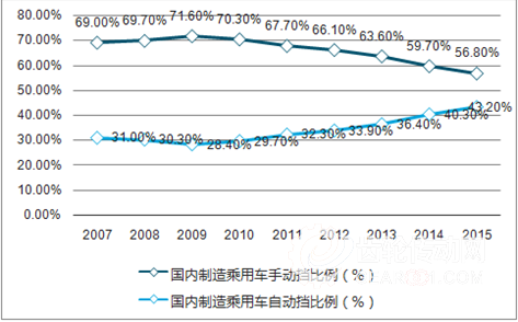 國(guó)內(nèi)制造乘用車手動(dòng)擋、自動(dòng)擋比例(%)
