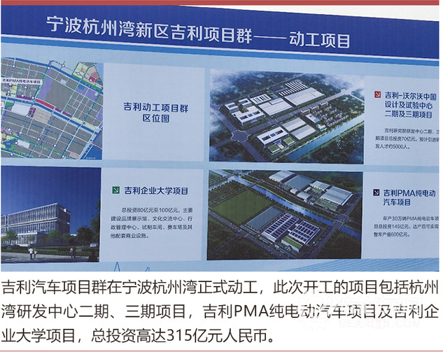 2017年5月,吉利杭州灣研發(fā)中心正式啟用,該研發(fā)中心將承載產(chǎn)品開(kāi)發(fā)和新能源等多項(xiàng)技術(shù)突破的任務(wù)。2018年3月12日,記者從吉利汽車官方獲悉:吉利汽車項(xiàng)目群在寧波杭州灣正式動(dòng)工,此次開(kāi)工的項(xiàng)目包括杭州灣研發(fā)中心二期、三期項(xiàng)目,吉利PMA純電動(dòng)汽車項(xiàng)目及吉利企業(yè)大學(xué)項(xiàng)目。根據(jù)官方公布的信息,吉利針對(duì)本次項(xiàng)目群的總投資高達(dá)315億元人民幣。