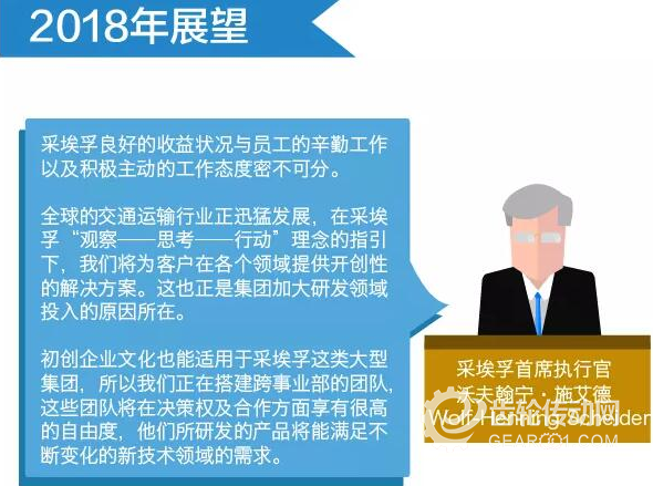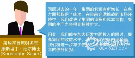 2018年2月1日上任的采埃孚(ZF)首席執(zhí)行官沃夫翰寧·施艾德(Wolf-Henning Scheider)先生在于3月22日在腓德烈斯哈芬介紹集團(tuán)年度財(cái)務(wù)情況時(shí)宣布:采埃孚股份公司(ZF Friedrichshafen AG)將會(huì)進(jìn)一步加大在研發(fā)領(lǐng)域的投入,同時(shí),集團(tuán)也將加快在未來(lái)交通運(yùn)輸領(lǐng)域技術(shù)的輸出。集團(tuán)2017財(cái)年銷售額達(dá)到創(chuàng)紀(jì)錄的364億歐元,去除匯率以及并購(gòu)因素影響,自然增長(zhǎng)率達(dá)到6%。集團(tuán)收購(gòu)天合的債務(wù)也進(jìn)一步減少;盡管研發(fā)開支有所增長(zhǎng),調(diào)整后的息稅前利潤(rùn)(EBIT)仍達(dá)23億歐元。