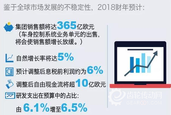 全球市場(chǎng)風(fēng)云變幻。考慮到這些市場(chǎng)因素,采埃孚首席執(zhí)行官施艾德預(yù)期,2018財(cái)年的自然增長(zhǎng)率將為5%左右。采埃孚向香港立訊有限公司(Luxshare Limited)出售全球車身控制系統(tǒng)業(yè)務(wù)的交易預(yù)計(jì)會(huì)很快完成,這將會(huì)使銷售額的增長(zhǎng)放緩。因此,在本財(cái)政年度,采埃孚預(yù)計(jì)集團(tuán)銷售約為365億歐元。如之前幾年一樣,采埃孚預(yù)計(jì)調(diào)整后的息稅前利潤(rùn)率約為6%,調(diào)整的自由現(xiàn)金流量將超過(guò)10億歐元。