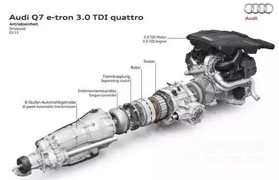 ▲ 上圖奧迪Q7 E-tron就是標(biāo)準(zhǔn)的P2架構(gòu)