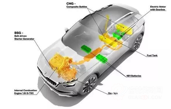 與此同時(shí),在內(nèi)燃機(jī)上,還有一套P0架構(gòu)的弱混系統(tǒng)來進(jìn)一步降低內(nèi)燃機(jī)的起步工作負(fù)荷,在斯柯達(dá)Vision X概念車上,這臺小電動(dòng)機(jī)的額定工作扭矩為70牛·米。