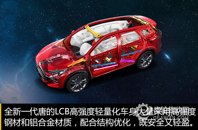 車身設(shè)計(jì)是被動(dòng)安全的基礎(chǔ),比亞迪全新一代唐采用了LCB高強(qiáng)度輕量化車身,通過結(jié)構(gòu)優(yōu)化、大量采用高強(qiáng)度鋼材和鋁合金材料,增加車身剛性的同時(shí)還能有效降低車重,實(shí)現(xiàn)安全、操控、節(jié)能的兼顧。