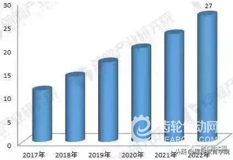 據IFR預測,隨著產業轉型升級的需求,人力成本的上升,以及國家政策的扶持,2017-2022年我國工業機器人未來的增速可達30%以上,到2022年我國工業機器人年銷售量超過27萬臺。