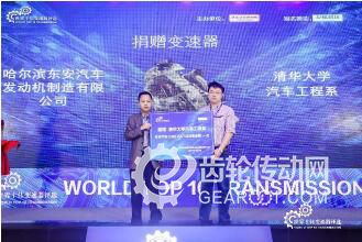 哈爾濱東安汽車發動機制造有限公司總經理助理于忠貴(左一)向清華大學汽車工程系捐贈獲獎變速器