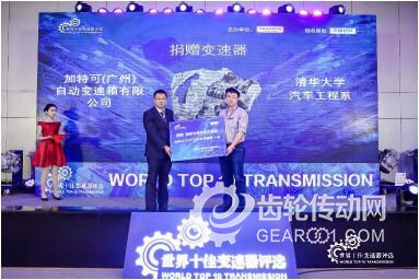 加特可(廣州)自動變速箱有限公司開發部長洪震(左一)向清華大學汽車工程系捐贈獲獎變速器