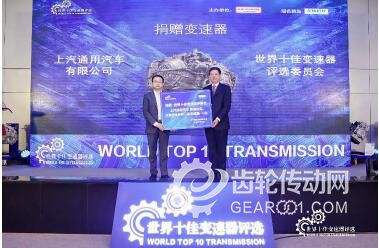 汽車評價研究院院長李慶文(右一)代表世界十佳變速器評選委員會接受泛亞汽車技術中心驅動系統部變速箱總工程師汪新云捐贈獲獎變速器