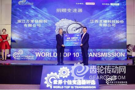 江蘇龍蟠科技股份有限公司董事長石俊峰(右一)代表龍蟠科技接受浙江萬里揚股份有限公司執行總裁張志東捐贈獲獎變速器
