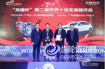 中國品牌建設促進會專家、中央民族大學中國城市品牌評價中心主任解樹江(右一)、上海交通大學汽車工程研究院副院長張建武(左一)為廣汽汽研院首席技術總監祁宏鐘(左二)、廣汽新能源汽車有限公司黨委書記、紀委書記、工會主席黃河(右二)頒發世界十佳變速器獎杯獎牌。