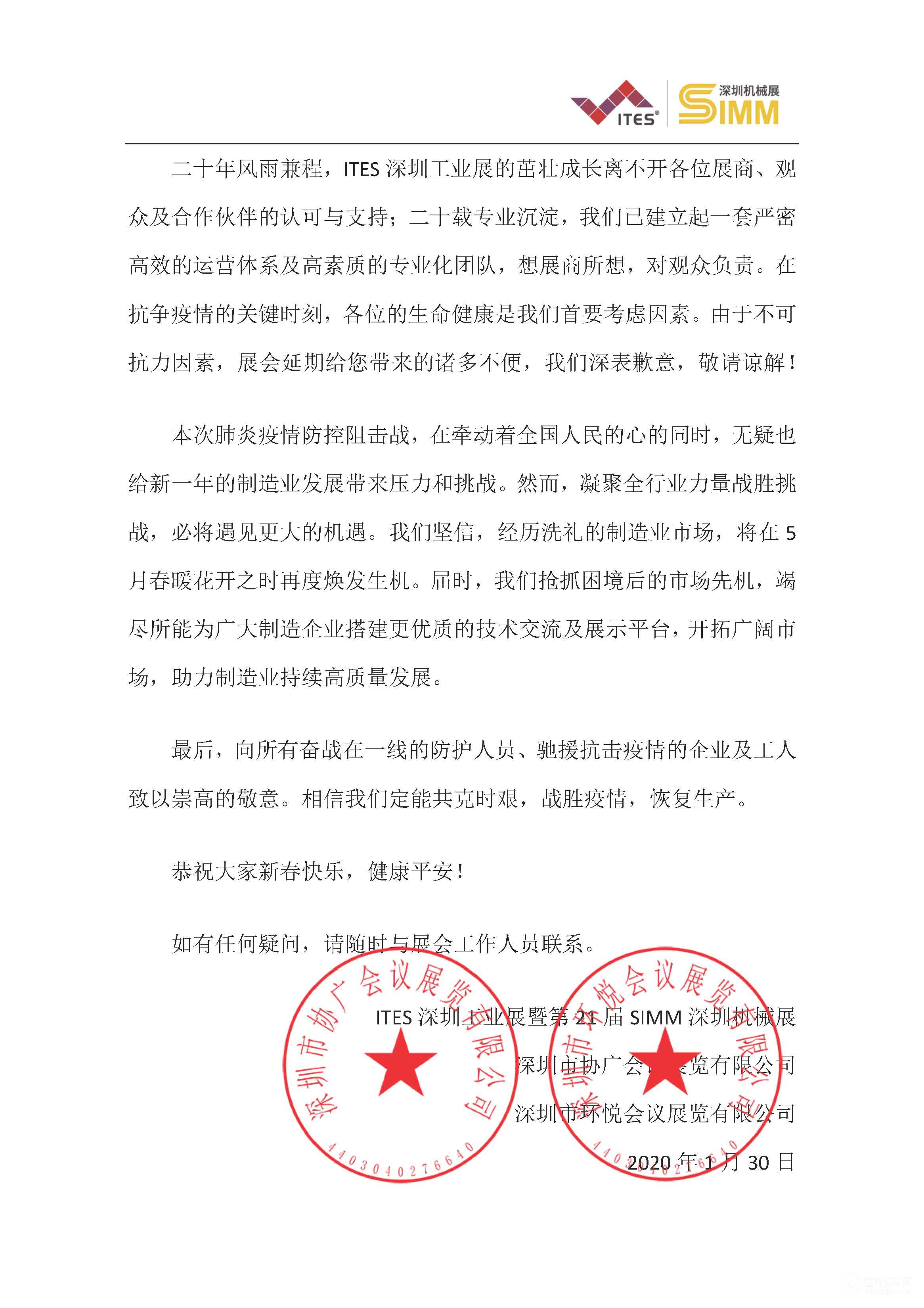 鑒于目前全國(guó)人民抗擊新型冠狀病毒感染肺炎疫情的攻堅(jiān)戰(zhàn)已進(jìn)入關(guān)鍵時(shí)刻,根據(jù)黨中央、國(guó)務(wù)院關(guān)于應(yīng)對(duì)新型冠狀病毒感染肺炎疫情防控工作部署及《中華人民共和國(guó)傳染病防治法》規(guī)定,以及根據(jù)《廣東省防控新型冠狀病毒感染的肺炎疫情工作領(lǐng)導(dǎo)小組辦公室關(guān)于限制群眾性活動(dòng)的通知》(粵衛(wèi)明電〔2020〕7 號(hào))、 《廣東省商務(wù)廳關(guān)于暫停大型經(jīng)貿(mào)活動(dòng)的緊急通知》及《深圳市新型冠狀病毒感染的肺炎疫情防控領(lǐng)導(dǎo)小組辦公室通告》的要求,在疫情防控期間暫停一切大型經(jīng)貿(mào)活動(dòng)及大型群眾聚集促銷活動(dòng)。