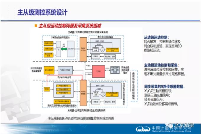 為了達到基準高精度測量和直接溯源的目標,又為了規避商品類儀器修正模型不向國內開放的限制,項目提出了空間軌跡曲線測量系統和生成運動控制系統分離的設計方案,整套裝置結構在國內加工和調試,其中空間軌跡生成運動控制系統采用了商用的坐標機多軸聯動控制方案和技術,只用來做齒輪螺旋線和漸開線軌跡的生成,而齒輪測量和溯源的部分則由空間軌跡跟隨測量系統實現,整個跟隨測量系統由項目獨立設計的二維激光干涉測量光路、自校準回轉工作臺系統、二維跟隨機構、主從級6軸驅動控制和測量采集系統以及四個漸開線螺旋線量化控制和測量補償模型組成。從外觀結構看,整套裝置變成了一個6軸坐標系統,空間軌跡跟隨測量系統被嵌套于齒輪空間軌跡生成系統(齒輪測量中心)內,但又相互分離。跟隨測量系統具備如下三個特點: