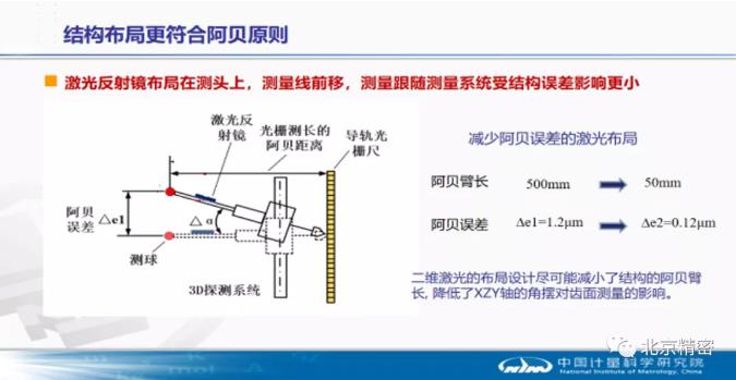 且二維激光光路經過優化設計,將小反射鏡固定在3D探測系統的測桿上,實際的測量線從原來軌跡生成系統的導軌光柵尺布局的500mm處前移到了距離探測測頭的50mm處,結構布局更符合阿貝原則,這樣當儀器導軌角擺誤差同樣為0.5″時,可以使齒面展成測長誤差從De1=1.2μm降低到De2=0.12μm,因此軌跡生成系統的三軸結構誤差對齒輪參量測量結果的影響大大降低。