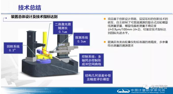 新一代螺旋線基準裝置在研究齒輪空間幾何曲線綜合測量和溯源方法的基礎上,設計并實現了雙激光干涉光路用于空間復雜型面--漸開線及螺旋線的測量技術、帶載回轉工作臺角度自校準修正技術、三維探測掃描系統撓曲補償技術、主從級閉環多軸聯動驅動控制和測量技術等多個儀器關鍵單元技術,成功研制了可直接溯源的復合式齒輪螺旋線測量裝置,螺旋線偏差測量不確定度U=0.9μm/100mm (k=2),經技術鑒定及國際比對驗證,螺旋線測量能力及技術指標達到國際先進水平。