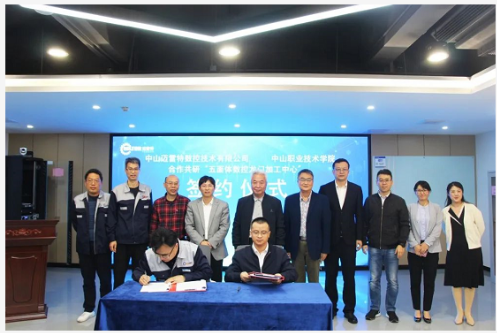 簽約儀式上,邁雷特總顧問肖利偉與中山職業技術學院付林處長共同簽署“五面體數控龍門加工中心”合作共研協議。