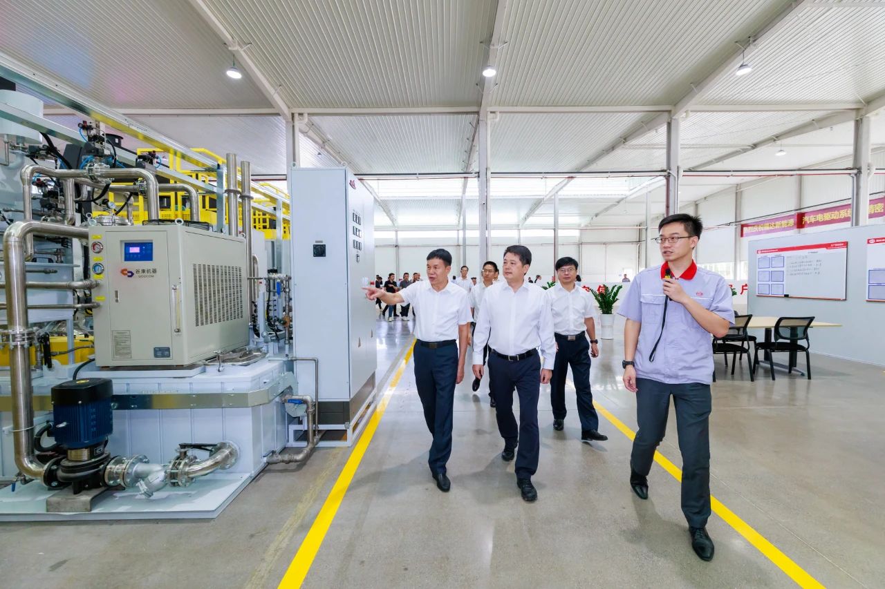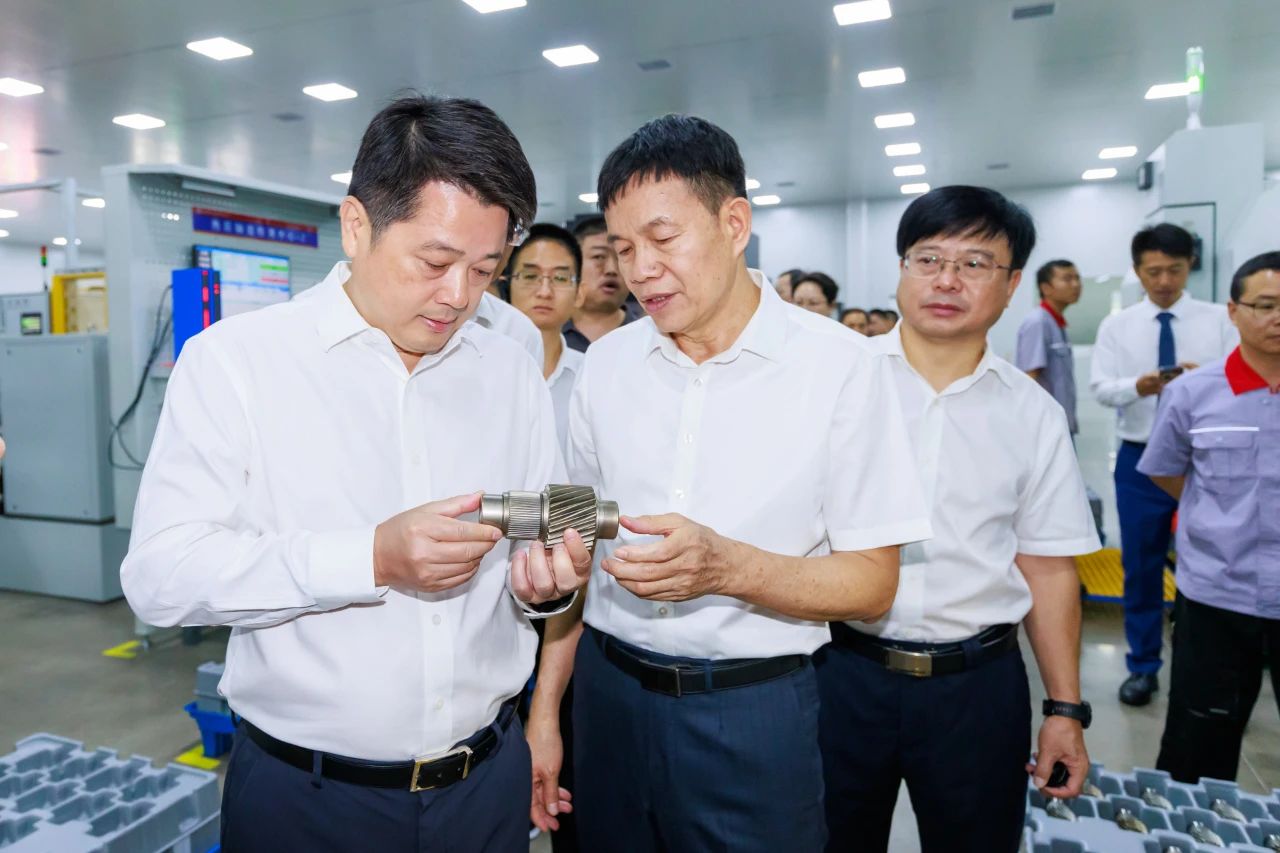 ▲桂林市市長李楚及參加投產儀式的領導嘉賓參觀福達新能源電驅齒輪項目生產廠區