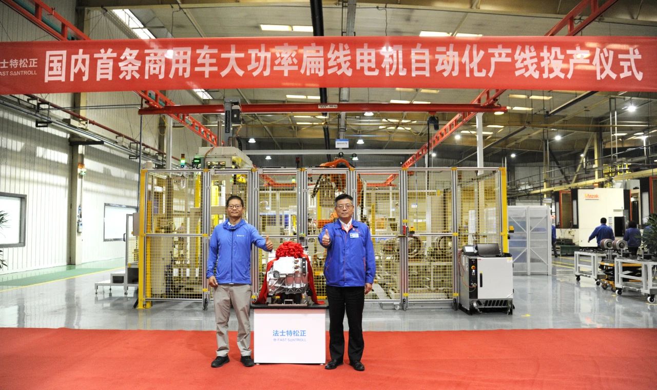 金秋送爽、碩果飄香。9月26日,法士特松正公司舉行國內首條商用車大功率扁線電機自動化產線投產儀式。法士特集團黨委書記、董事長馬旭耀,天津松正董事長孔昭松出席儀式,共同為自動化產線下線的首臺電機產品披紅掛花。