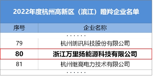 近日,杭州高新技術產業開發區(濱江)經濟和信息化局和杭州市濱江區經濟和信息化局共同發布了《關于認定2022年度杭州高新區(濱江)瞪羚企業的通知》,萬里揚控股子公司浙江萬里揚能源科技有限公司(以下簡稱“萬里揚能源公司”)獲評2022年度杭州高新區(濱江)瞪羚企業。這也是萬里揚能源公司繼“國家高新技術企業”、“浙江省科技型中小企業”之后取得的又一榮譽。