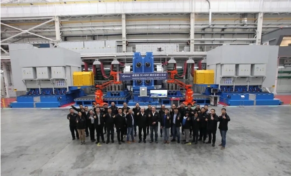 路雖遠,行則將至。歷經兩年的不懈努力,威能極位于天津的26.4MW驅動鏈測試臺經過一個月的試運行于2023年10月竣工并正式投入使用,成為目前全球最大功率測試臺。該測試臺擁有超前的設計理念并匯集了眾多國際先進技術,如威能極自主開發、設計、安裝的模擬主軸支撐系統,其額定/最大扭矩可達32.5/65MNm;它配備世界領先的變頻器首次應用了威能極自主知識產權的控制系統,并安裝了世界首臺最大功率可達26.4MW的異步電機;測試臺地基可承受的動態載荷高達1000噸,并配有150噸天車用來吊裝風機驅動鏈與部件。