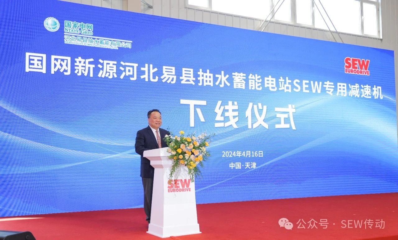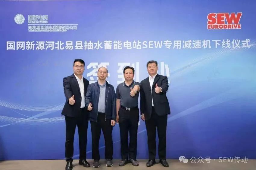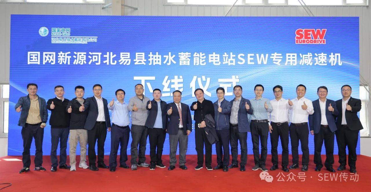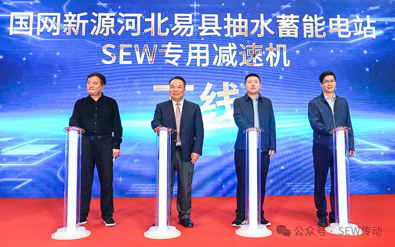 上午10點58分,在SEW重型工業減速機制造工廠內,國網新源集團-河北易縣抽水蓄能電站SEW專用減速機下線儀式正式開始。SEW中國公司執行董事長張勝利先生與河北易縣抽水蓄能有限公司機電物資部主任郭治塘先生、鄭州水工機械有限公司總經理王學信先生、中國電建集團北京勘測設計研究院有限公司-水電與抽水蓄能工程院副院長胡霜天先生共同上臺,攜手按下啟動機關,為這一時刻注入強大的驅動力量,隨著高大的帷幕從塔架上快速落下,兩臺巨大的900T固卷啟閉機專用減速機完美地展現在眾人面前,燈光閃爍,萬眾矚目,成為整場的明星。SEW專用減速機量身定制的設計方案、精湛的工藝和卓越的性能吸引了在場所有人的目光,來賓們紛紛上前觀看,合影留念,共同見證國網新源集團-河北易縣抽水蓄能電站SEW專用減速機的成功下線。