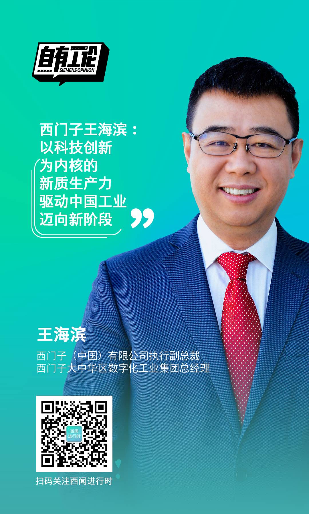 志和越山海,聚力共前行。回溯西門子與中國同行的150多年歷程中,我們與無數中國企業共同成長、彼此成就。如今,新質生產力正驅動中國工業邁向下一個階段,這注定將是一個技術“狂飆”、產業加速變革的新時代,西門子愿繼續與中國企業書寫由“制造”向“智造”,再向“質造”演變的創新故事,攜手推動中國工業向前、向新、向綠,共赴數字化與可持續發展的光明未來。