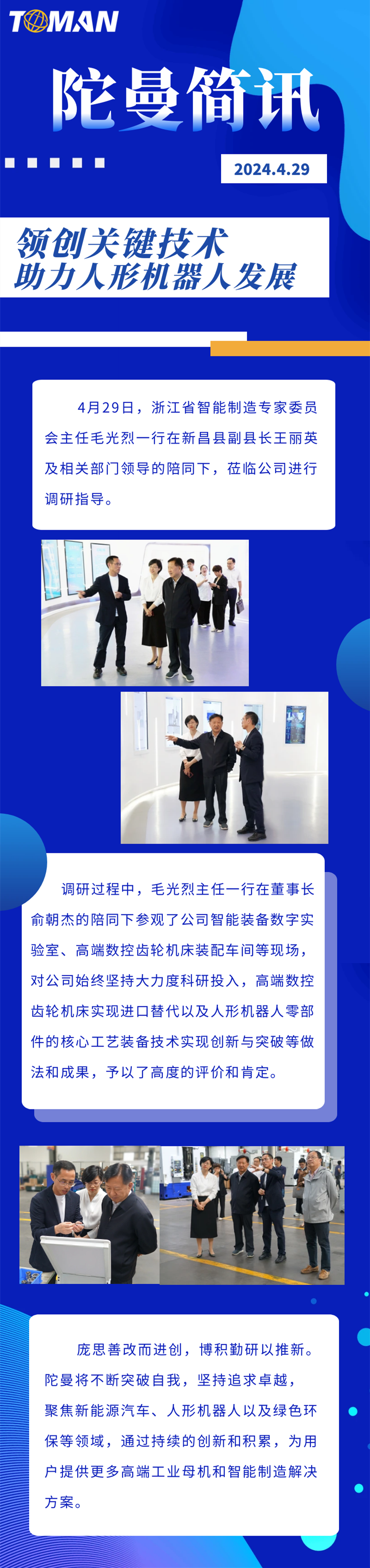 4月29日,浙江省智能制造專家委員會主任毛光烈一行在新昌縣副縣長王麗英及相關部門領導的陪同下,蒞臨公司進行調研指導。