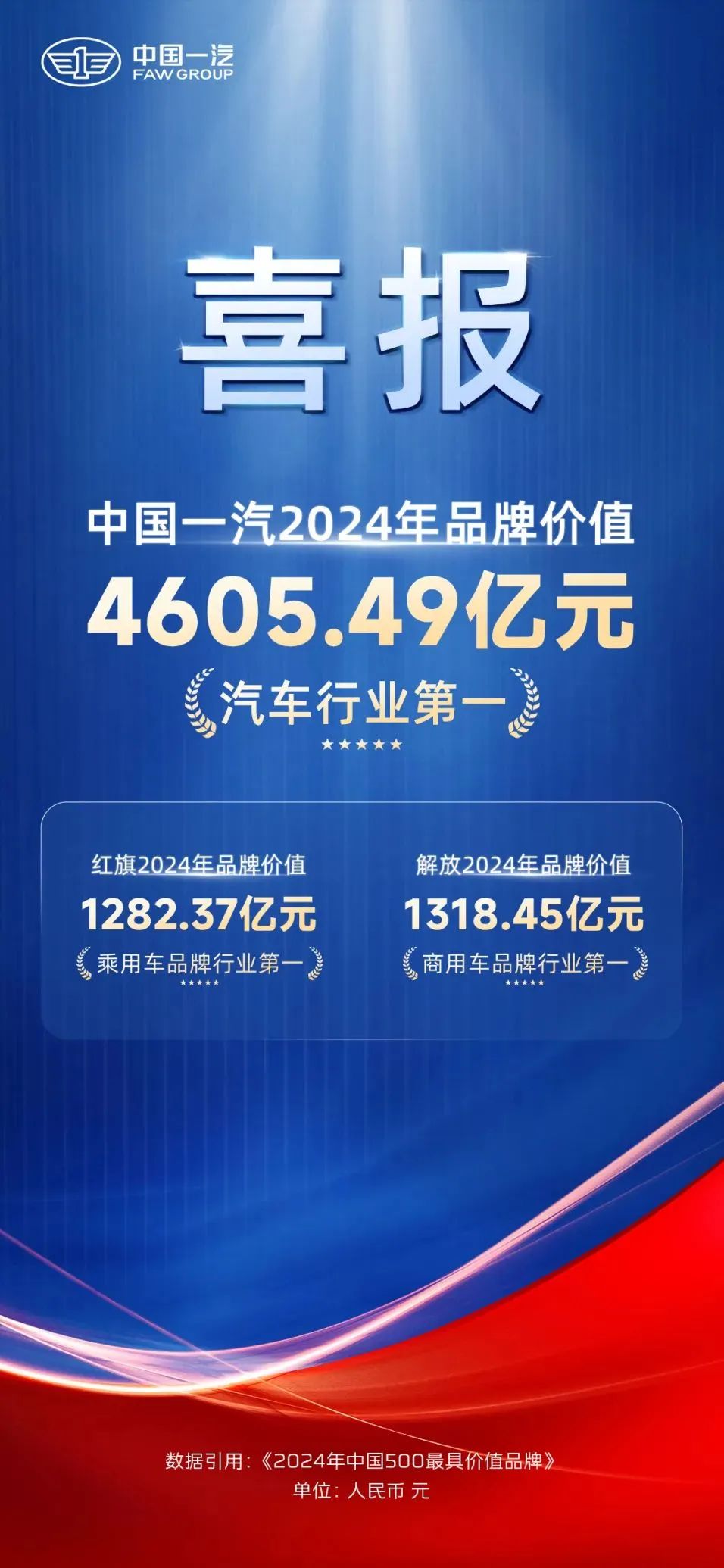 6月19日,第二十一屆“世界品牌大會”在北京舉行。會上,世界品牌實驗室發布了2024年《中國500最具價值品牌》分析報告,中國一汽2024年品牌價值為4605.49億元,蟬聯汽車行業第一,連續21年上榜中國500最具價值品牌。