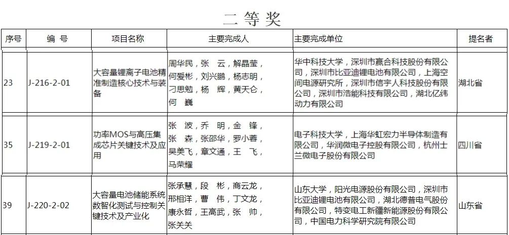 2023年度國家科學技術進步獎創新團隊二等獎獲獎項目中,還出現了華中科技大學、深圳市贏合科技股份有限公司、深圳市比亞迪鋰電池有限公司等共同完成的《大容量鋰離子電池精準制造核心技術與裝備》;電子科技大學、上海華虹宏力半導體制造有限公司、華潤微電子控股有限公司、杭州士蘭微電子股份有限公司共同完成的《功率MOS與高壓集成芯片關鍵技術及應用》;山東大學、陽光電源股份有限公司、深圳市比亞迪鋰電池有限公司等共同完成的《大容量電池儲能系統數智化測試與控制關鍵技術及產業化》等多個汽車相關項目。