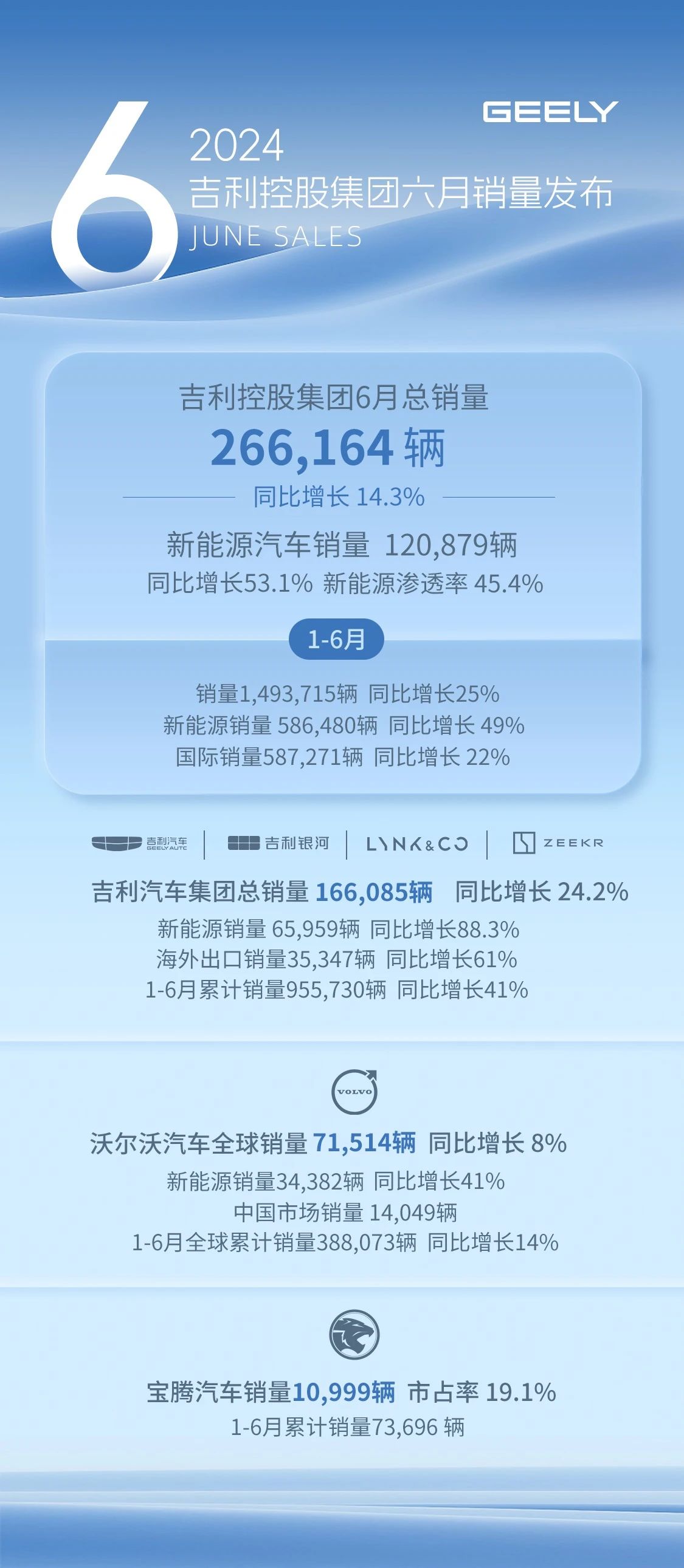 吉利控股集團(tuán)6月總銷量266164輛,同比增長14.3%