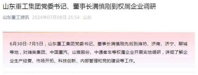 根據(jù)山東重工資訊,6月30日-7月5日,剛剛上任山東重工集團(tuán)黨委書(shū)記、董事長(zhǎng)的滿(mǎn)慎剛就先后到濰坊、濟(jì)南、濟(jì)寧、聊城等地,對(duì)濰柴集團(tuán)、中國(guó)重汽、山推股份、中通客車(chē)等權(quán)屬企業(yè)開(kāi)展實(shí)地調(diào)研,詳細(xì)了解企業(yè)生產(chǎn)經(jīng)營(yíng)、市場(chǎng)開(kāi)拓、科技創(chuàng)新、內(nèi)部管理和黨的建設(shè)等工作。