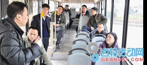 上海申龍客車有限公司副總經理賴雪鳳和廈門金龍旅行車有限公司副總經理陳篤廉一行在試乘我公司AMT變速器試驗客車中聽取我公司有關專家講述AMT變速器的性能概況。