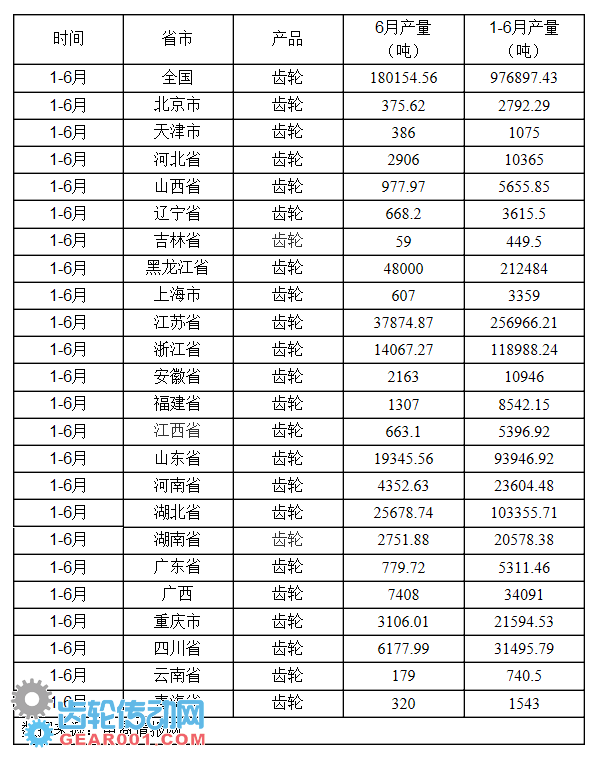 中商情報網統計數據顯示2012年1-6月中國齒輪產量976897.43噸。
