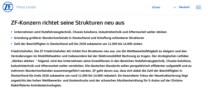 而今,裁員規(guī)模正式敲定了下來(lái),為1.1萬(wàn)~1.4萬(wàn)人,且是在2028年底前,較原計(jì)劃有所提前。目前,采埃孚在全球擁有約16.87萬(wàn)名員工,其中德國(guó)員工共計(jì)5.4萬(wàn)人。這意味著,將有約1/4的德國(guó)員工不得不離開(kāi)采埃孚,這是一個(gè)相當(dāng)高的比例。
