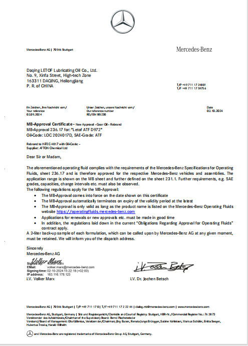 2024年10月2日,勞特潤滑油正式通過梅賽德斯-奔馳9速MB236.17認證,成為國內首家通過此認證的潤滑油企業。梅賽德斯-奔馳是世界上為數不多能夠自主生產自動變速箱的汽車廠商。配備奔馳最新9速自動(9G-Tronic)變速器的車型,主要集中于2016款及以后,目前正在逐漸在各個系列中進行更新配備,為奔馳未來的主力變速器。