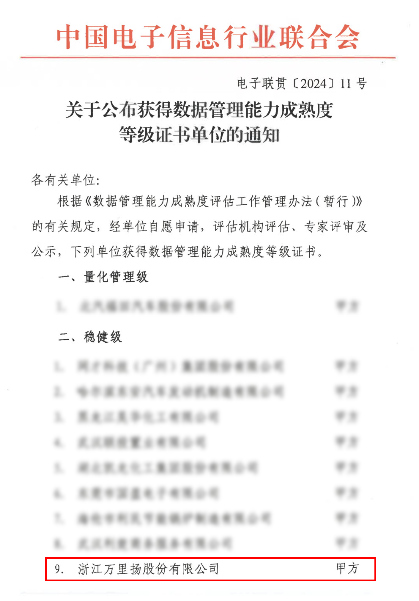 近日,中國電子信息行業聯合會發布了《關于公布獲得數據管理能力成熟度等級證書單位的通知》(電子聯貫【2024】11號),萬里揚成功通過國家數據管理能力成熟度(DCMM)三級認證,標志著公司在數據管理領域的能力得到權威認可,已達到穩健級水平。