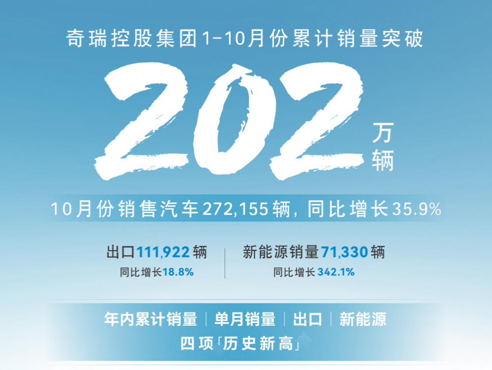 作為中國最早突破百萬銷量的自主汽車品牌,奇瑞自1997年成立以來,通過持續(xù)的自主研發(fā)和技術(shù)突破,已逐步成長為全球知名汽車制造商,且市場表現(xiàn)強勁。2024年1-10月,累計銷量達到202.49萬輛,同比增長39.3%。其中,10月汽車銷量達到27.22萬輛。旗下捷途品牌2024年1-10月累計銷量達43.93萬輛,同比增長89.3%。其中,10月的銷量超過6.2萬輛。此外,奇瑞已連續(xù) 21 年保持了中國品牌乘用車出口第一名。